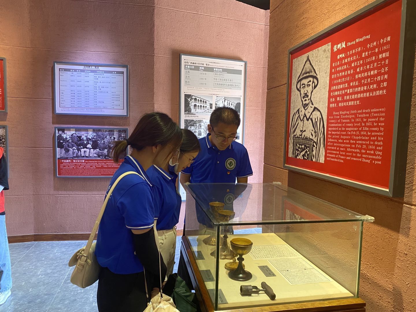 上午11:40,大家满怀热情地参观遗址。我们先后到展览厅、神父房、修女房参观,通过学习墙报、油画及复原场景,我们对“西林教案”——马神甫事件的历史有了详细了解。马神甫事件是在1856年由新任知县逮捕法国天主教神父马赖引起的,随后法国与英国联合向中国发动了第二次鸦片战争。整个过程中,大家愤慨激昂如身临其境,从各种展物中能够切实体会到中国人民勇于反抗外来侵略的斗争精神。对于我们新一代青年来说,这具有深刻的爱国主义教育意义,让我们感慨万千。